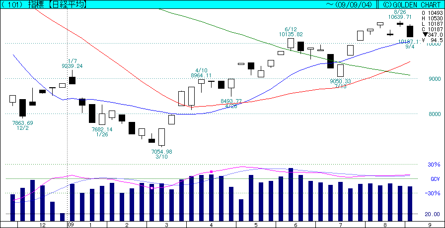 今のところ拙者下値予想は、日経¥10,000(75日線、13週線、3/10と7/13の下値支持線)と見ておりまする。ここを割らずに下げ止まれば、長期移動平均線は全て上向きなので、上昇相場継続と考えられ、いわば絶好の押し目となるかと存じまする。