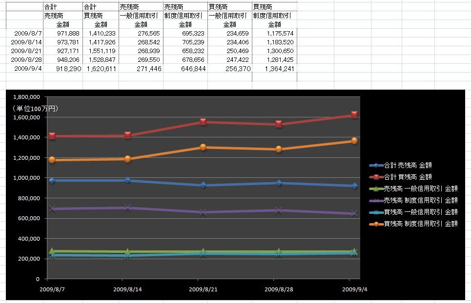 この週(8月31日―4日)は、前の週の8月26日に日経平均株価が1万668円の高値をつけたこともあり、相場は調整色が強まった。週末の取引時間中に日経平均は1万143円まで下げ、投資家は値ごろ感から買いを入れたとみられる。世界経済は最悪期を脱したとの見方から、今後株価が上昇すること見込んでいる投資家が多いようだ。信用売り残高は減少に転じた。売り残高は299億円減の9182億円だった。