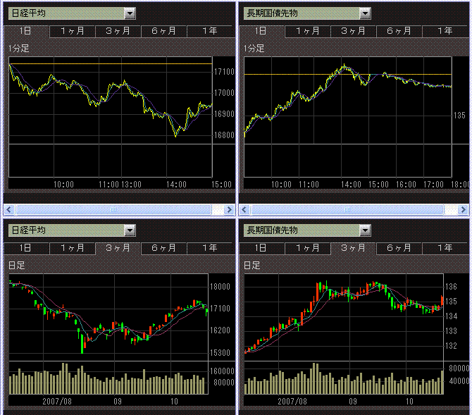 ・インドについては、他のアジア市場はたいした影響はなかったですし、日本市場の下げはインドを理由にしての仕掛けでしょう。JGB先物が高くなっていたので、JGB先物買い・株先物売りのペアトレードがさかんに行われたと推測されます(画像1参照。長期国債先物の前日終値の黄色の横線は、今日の日中取引の終値の位置になっています。昨日の終値はもっと下で、日足でみればわかるように今日は大幅高です)。明日以降の株価指数先物の強弱を見るには、このJGB先物が買われるかどうかを見るとある程度判断できるのではと思います。このペアトレードが活発に行われていない時は、JGB先物はたいして気にしなくて良いのですが、今みたいに大きく動いて活発な時はJGB先物もチェックしておくと相場の動きを把握しやすいです。