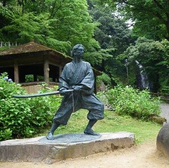 おい、みんな、ここが一乗滝で、あれが佐々木小次郎の銅像だ