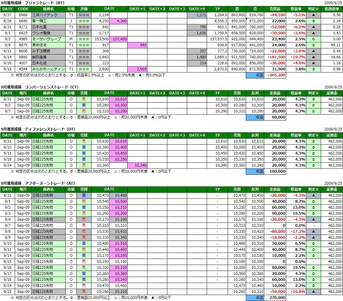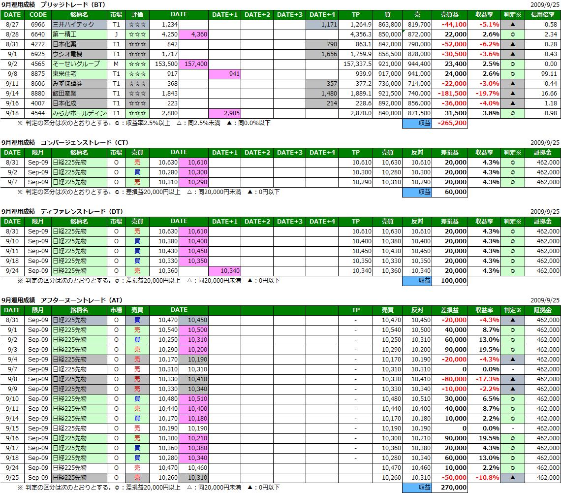 9月第4週としては株式▲4,500円、日経225先物▲20,000円(1枚の場合)の運用成績となりました。