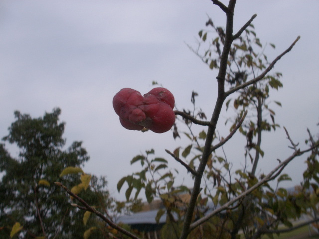 写真1:めずらしい、赤赤とした破裂前の実です