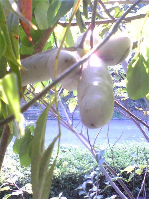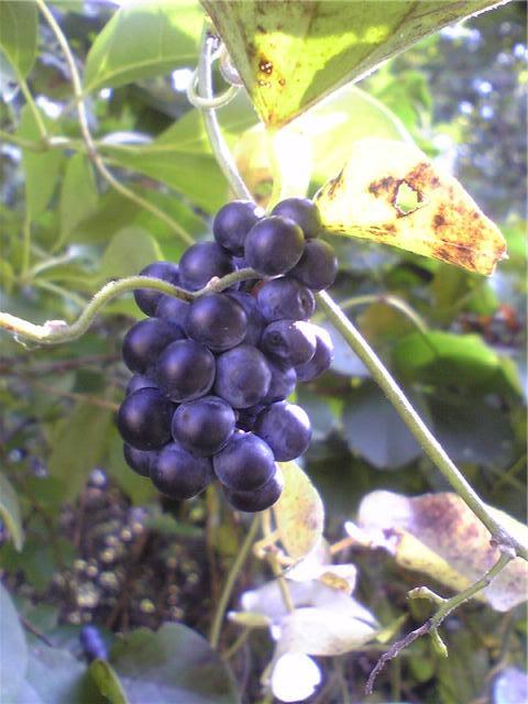 はな、やまぶどう 木の実 アケビ:やまぶどうのようですが綺麗過ぎます。台風一過の秋晴れで、けっこうコナラの木が折れていました。お目当てのアケビはもうなかったです。こんな小さなのがなっていました。