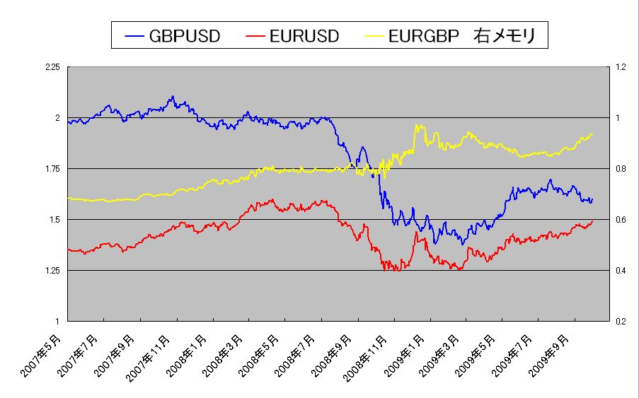 その関係を示したグラフです。 黄線はその比率と等しい EURGBP