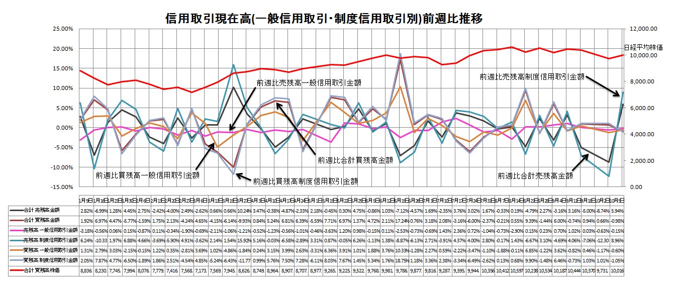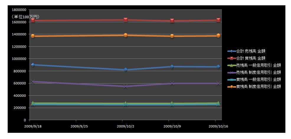 個別銘柄ではJAL(9205)の信用残が売り残、買い残ともに大幅に増加。株価は週末まで4日続落して一時は100円ちょうどまで下げたが、下値では買い残も膨らんだもよう。信用取引による売り買いの残高は拮抗(きっこう)し、信用倍率は約1倍となった。一方、JALに対する債権放棄を迫られるとの懸念から4日続落したみずほFG(8411)は、買い残が大幅に増加した。