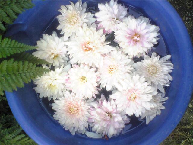 はな、菊:選定で捨てられた菊を水盤に張ってみました。もったいないの精神です。