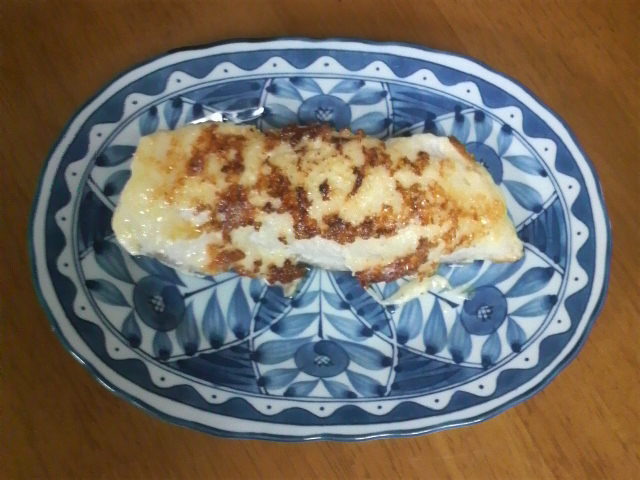 画像中央は「タラのマヨチーズ焼き」。これも絶対失敗のない料理でござる。コショウをふったタラの切り身を、まず裏面をフライパンで焼き、取り出してマヨネーズとシュレッド・チーズを混ぜたソースを表面に塗り、さらに粉チーズをふりかけてトースターで焦げ目がつくまで焼くだけ。嘘のように簡単で誰でも出来まする。