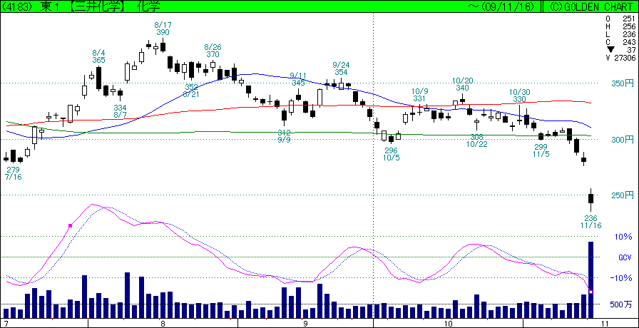 ご覧頂ければおわかりの通り、三社とも見事に同じようなチャートで大きく下げており、さしずめ「増資三兄弟」とでも申しましょうか。市場の反応がストレートに窺えまする。