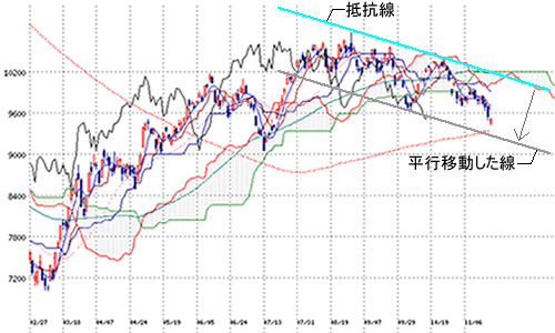 上のチャートで抵抗線を下に平行移動したラインを引いていますが、この幅で日経平均株価が動くとするならば、9,300円を切ったあたりが反転のひとつの目安になるのではないかと思います。