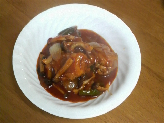 どうもきのこが入らずば拙者料理にあらずといった体があるので、今回はトマトソースとの相性を考え、しめじにしてみた次第。案外味が締まるので、拙者お薦めでござる(^^)