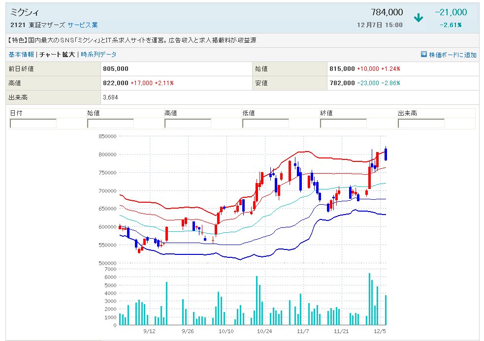 ううっ、・・ミクシィは下値を買われてまして、大きく下げないので、ここで買うと良いかもしれませんよー、火曜日か水曜日に上を目指すと思いますから、ここでもう1株買いをされたらいかがですかぁ?