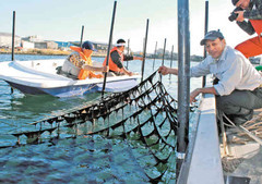 大田区大森地区で、元生産者たちが7日、海に海苔の種が付いた網を張った。年内には収穫できる見込み。