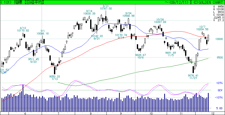 今週も日経のチャートを見てみますると、先週は一旦¥10,000を割り込みながら、金曜に大きく戻し、日足(左側・緑色チャート)で75日線、週足(中央・青色チャート)で13週、26週線を回復しており、まだ底堅い相場と申せましょう。