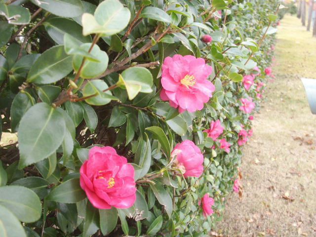 冬に至り、さざんかの垣根に花がいっぱい咲いている