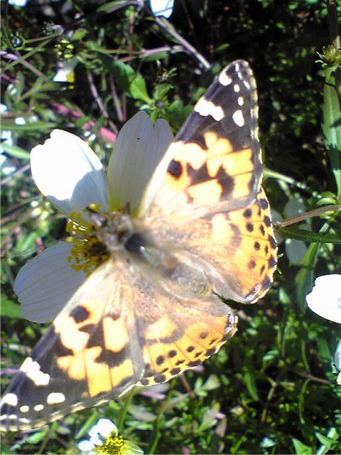 はな、ちょう、雪:雪が積もりましたが、今はいい天気です。昨日は寒い中、蝶も舞い、日向ぼっこ。ウインターコスモスにヒメアカタテハが給蜜に来ていました。農業センターにて。