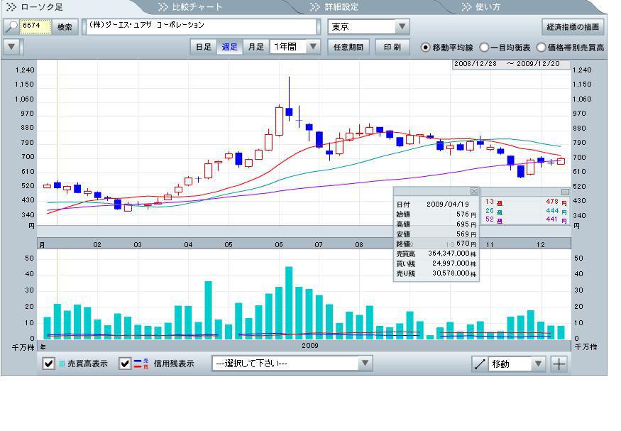 2009/12/26GSユアサ が反発。株価指数など市場全体が利益確定の売りに押される中、本日高値の703円で取引を終了。国内格付け会社のJRIが、同社の格付けをを「BBB-」から「BBB」に格上げした事が素直に好感されたようだ。」