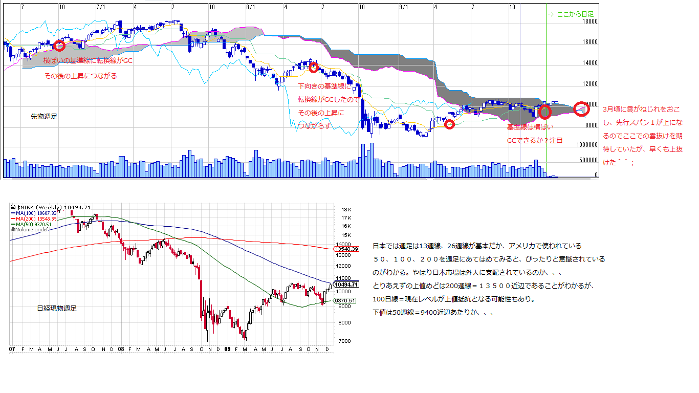 ・週足基準線は横ばいなので、転換線とのGCに成功するものと予想される。