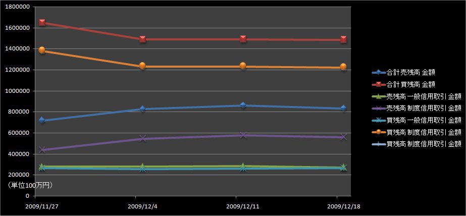 東京証券取引所が発表した12月25日申込時点の信用取引の買い残高(東京・大阪・名古屋3市場、制度信用と一般信用の合計)は2週連続の減少。