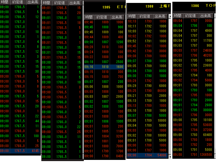 画像は、6月1日の寄付直後のTOPIX先物とETFの約定値です。