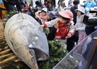 商売繁盛の神様「えべっさん」の総本社として知られる西宮神社で8日、特大のクロマグロが奉納され、参拝客が頭にさい銭を張り付けて景気回復などを願った。