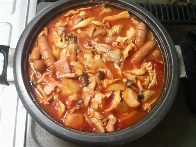 ぐつぐつ煮込むだけなのでいたって簡単、でも鶏肉とソーセージ、ベーコンから出汁が出るので、トマトの酸味に程よいこくが加わって実に美味でござりました(^^)