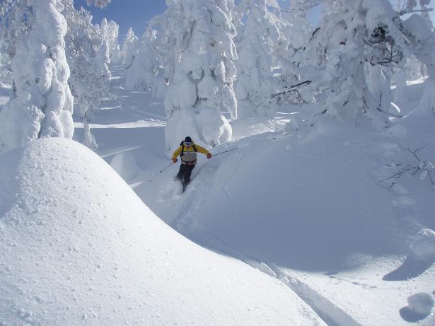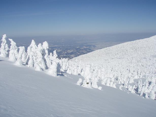 吾妻小屋から若女平へと滑り降りるが、まだ雪は少なめだろうか?沢筋は完全には埋まっておらず、少々フラストレーションの残る滑降となった。