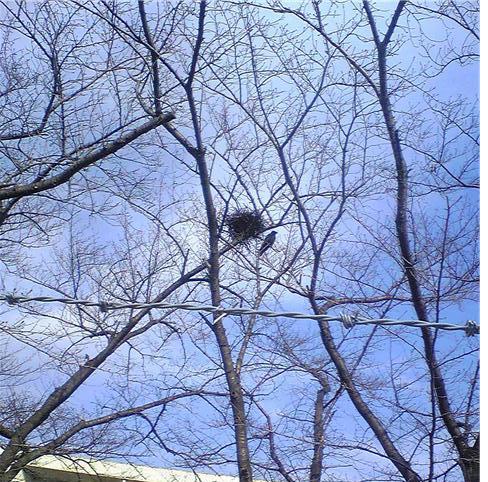 カラス、巣、さくら:建て替えられるために廃墟となった社宅があり、そこが静かになったのでカラスが巣を作っています。繁殖するころは取り壊されてしまうでしょう。桜の葉が落葉し明らかになりました。なんとなく悲しくなりますね。