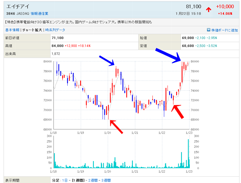 急上昇中に一気買いをするか、押したとこを分散買いするか、臨機応変に対処します