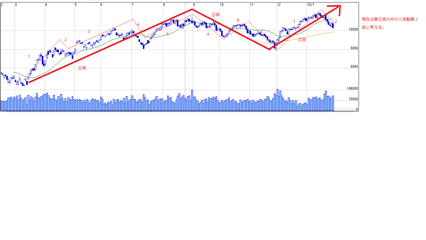 現在は上昇第③波のなかの小波動第2波の下落と最中だと思いますので、押し目の範囲であるという考えです。
