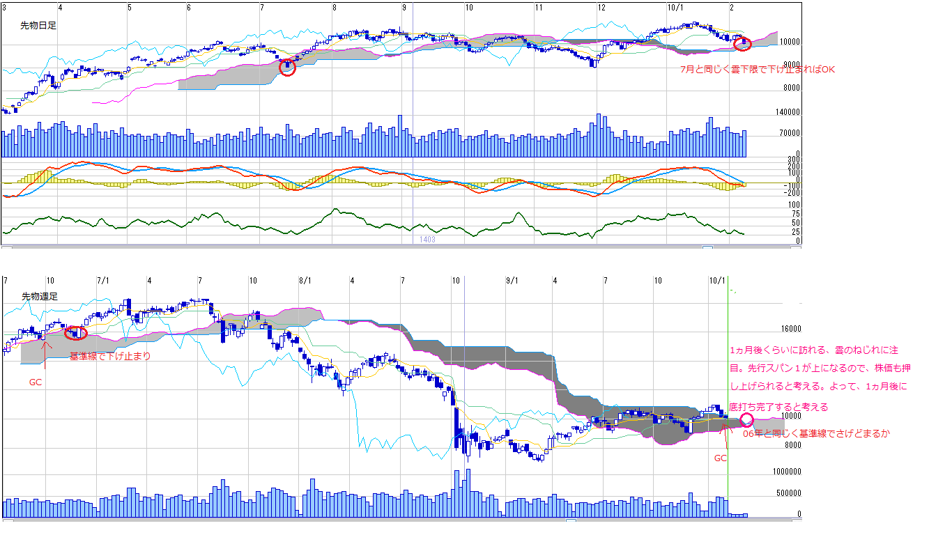 ・一ヵ月後に訪れる雲のねじれでの動きに注目。先行スパン1が上になるので、雲に押し上げられやすい状況となると思うので、雲を下値支持とした動きになると予想するけど、、、外部環境と投資家のセンチメント次第か。