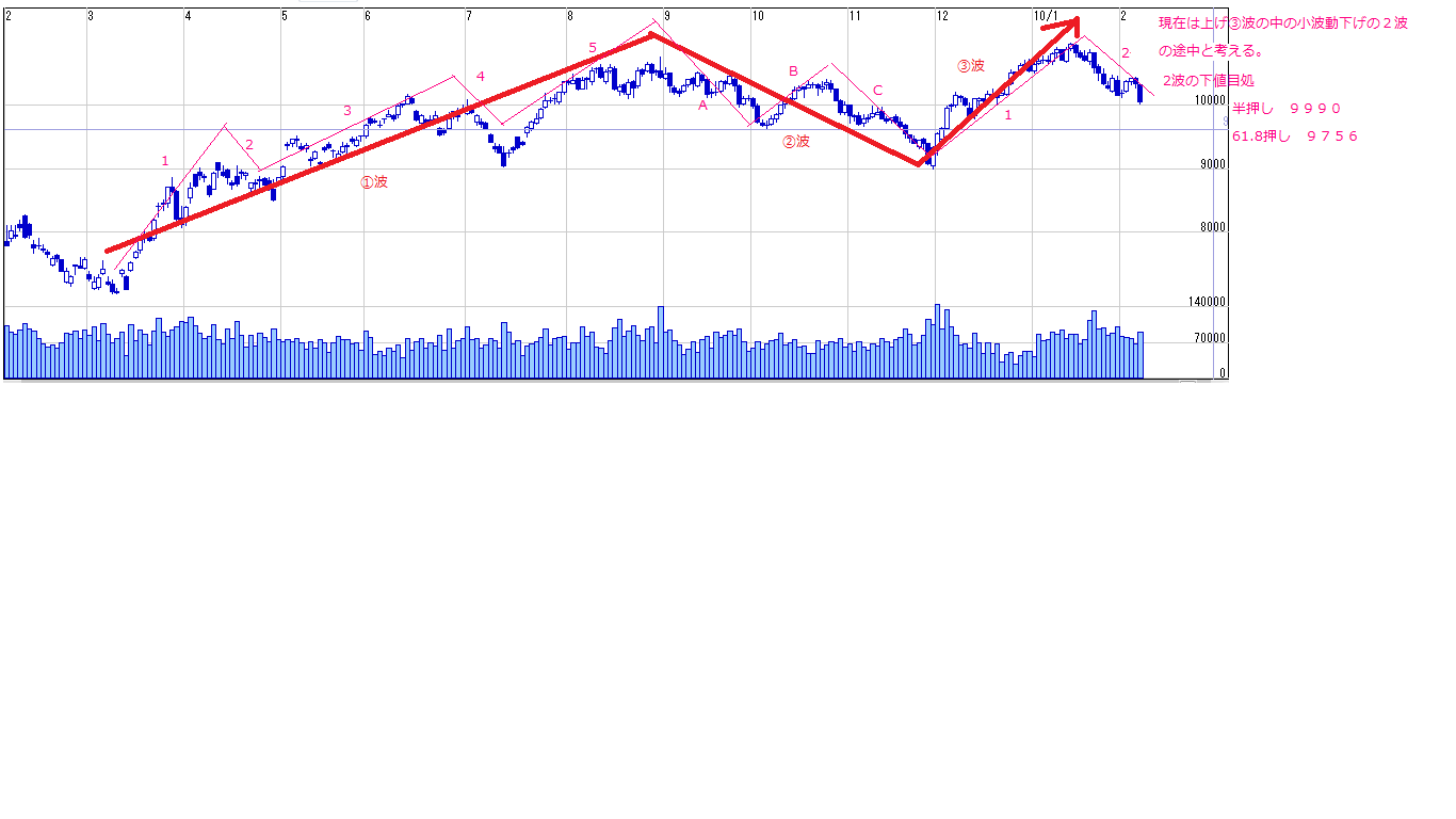 第2波の下値めど0.382押し10225はすでに達成済みなので、次は半押し=9990、61.8押し=9756。