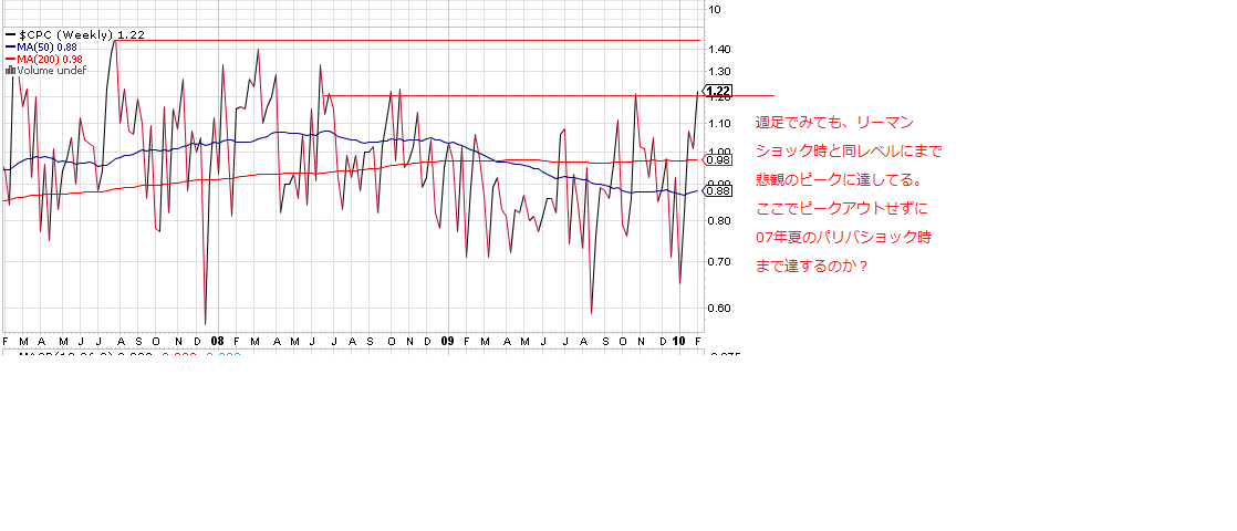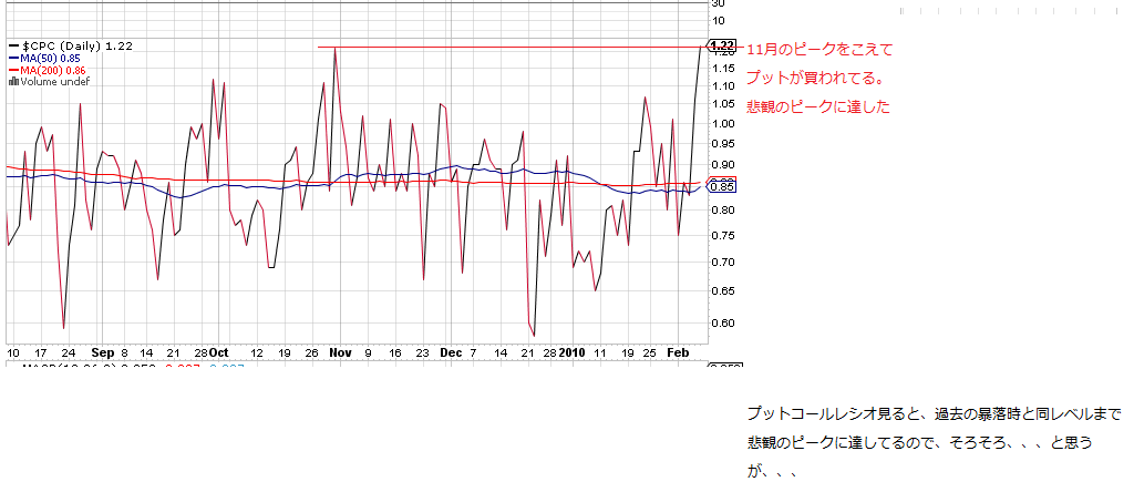 現在、過去のピーク圏までプットコールレシオが達している(逆相関の株価は下落)ので、悲観のピークに達したと考えています。