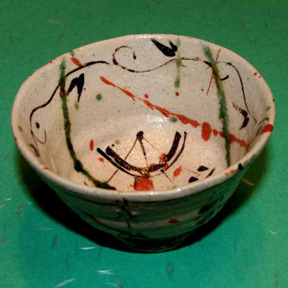帰りに、気に入った小振りの湯呑を1つ分けて頂きました。織部の緑・鉄の黒とピンクの釉薬が懸かったかわいい絵柄です。