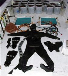 この画像の ボンテージ スーツ ? を 着て、手足を 縛られて