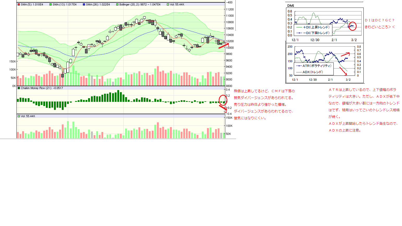・株価は上昇でも、CMFは下落してるので、CMFは弱気ダイバージェンス。