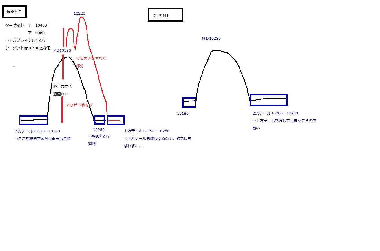 下方テール10110-10130を維持してるので弱気にもなれず、上方テール10260-10280を残してるので強気にもなれず、、、 とりあえず、週間MPのMD10220を基準に上下どちらかでみていくしかない
