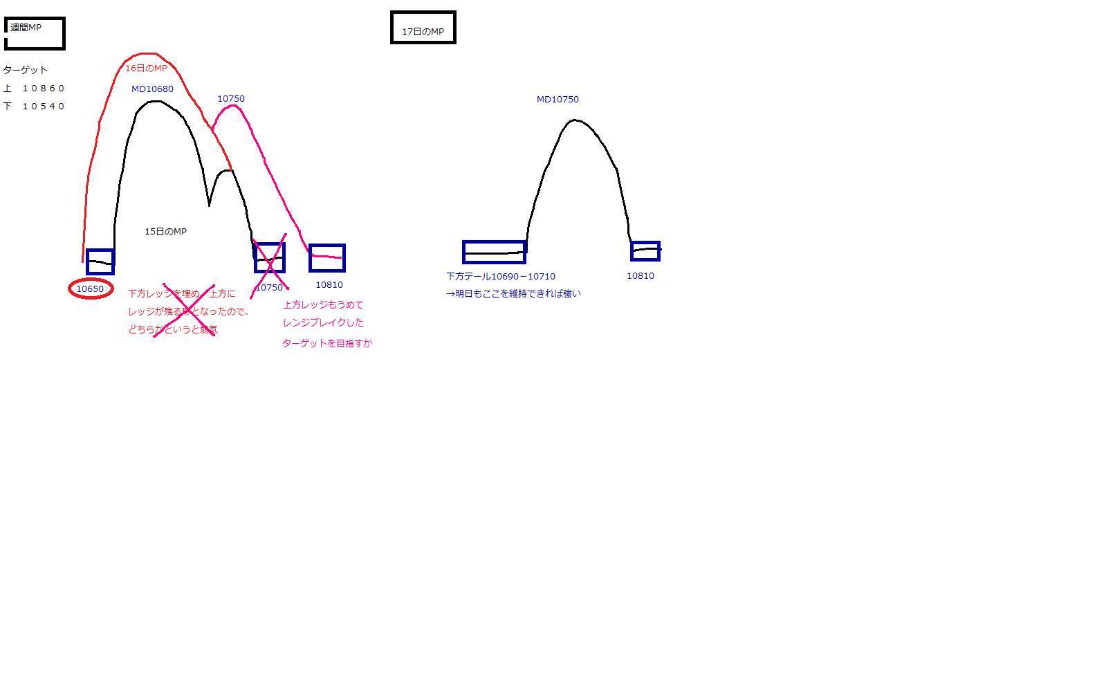 週間MPは上方ブレイク。上のターゲット10860を目指すと思う。