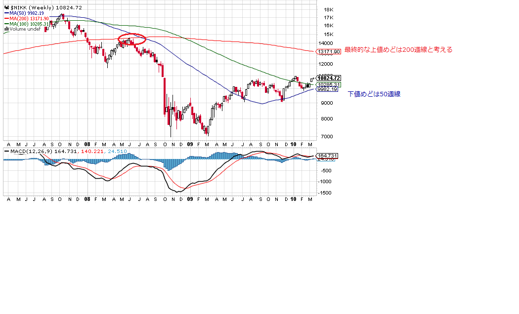 50週-100週のレンジ相場から50-200週のレンジ相場へ移行。100週が下値支持となるか。