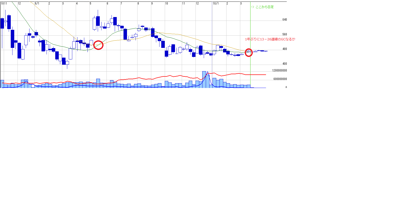 チャート的には復活の兆しありなんですけど、そう思うといつも悪材料でどっすーん↓みたいなのあったんですけど、さすがに悪材料も出尽くし、本格上昇には入れるかもしれないと期待してます^^ただし、個別銘柄はチャートより、ファンダメンタルに左右されるので注意が必要ですが、、、