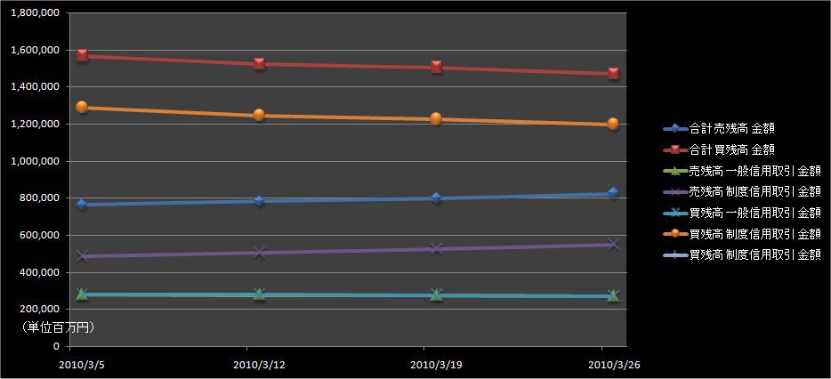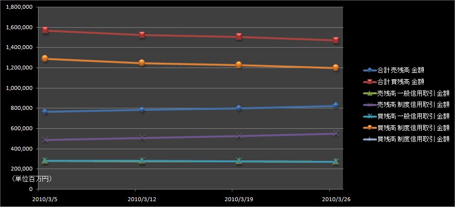 東京証券取引所が発表した3月26日申込時点の信用取引の買い残高(東京・大阪・名古屋3市場、制度信用と一般信用の合計)は4週連続の減少。