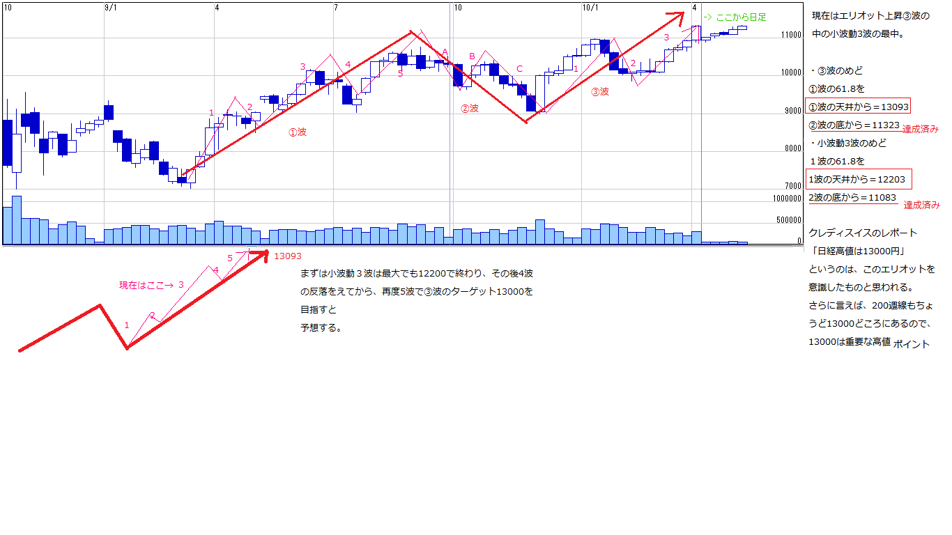 まずは小波動3波の上値めど11080、達成後に小波動4波の下げ(押し目)をはさんだ後に、小波動5波の上昇で第③波の上値めど13093を目指す。