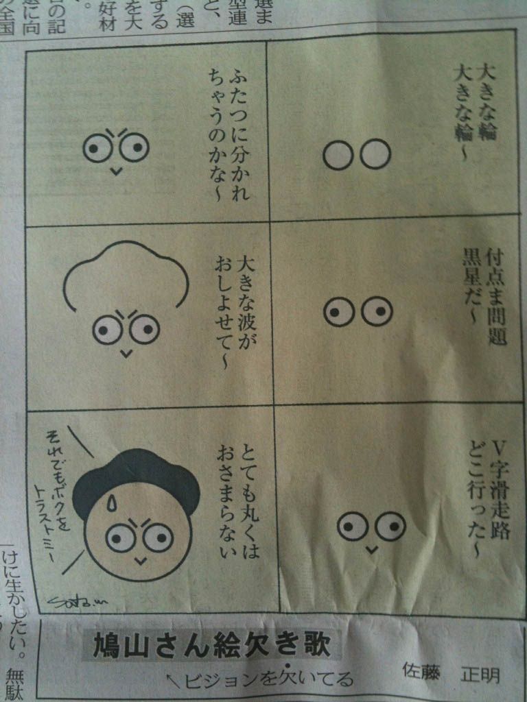 イラストは今日の(今朝の)中日新聞らしいです。別に鳩山首相は好きではないんですが、このイラストは流石に如何なものかと。