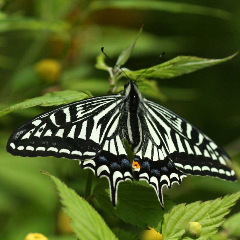 山吹に止まっている蝶です。オオゴマダラに似ていますが名前は不明