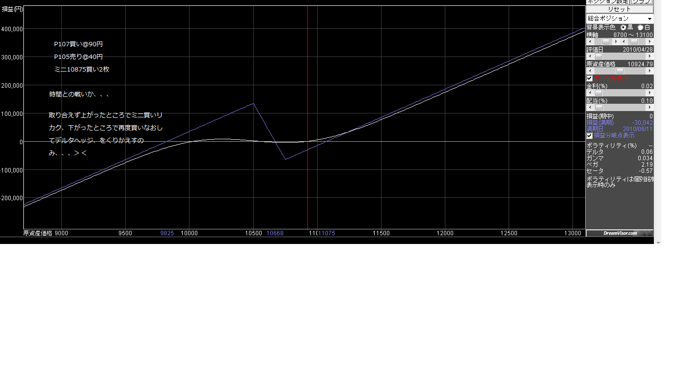 保有中のプット、上げ下げ激しいです^^;とりあえず、下がった所でミニ買ってデルタヘッジ、上がった所でミニ買いリカク、をくりかえしてます^^;