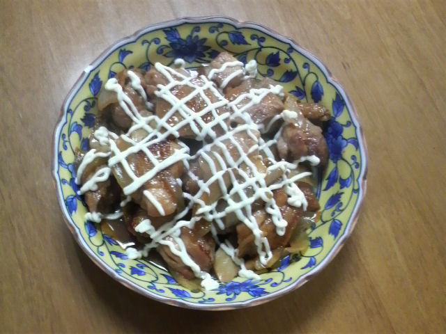 たれが煮詰まって照りが出てきたら、お皿に盛り付け、上からマヨネーズを格子状にかけて出来上がり。この手法は、大阪なんばの某お好み焼き店の真似をしておりまする。(嗚呼、またパクリ術か…)
