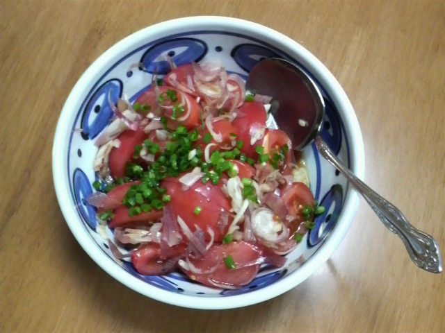 写真右が新作の副菜、「トマトのめんつゆ和え」。元ネタはオレンジページでござる。良く冷やしたトマトに輪切りのみょうがを加え、めんつゆと少々のごま油で和えまする。仕上げにみじん切りのわけぎを散らせて出来上がりでござる。