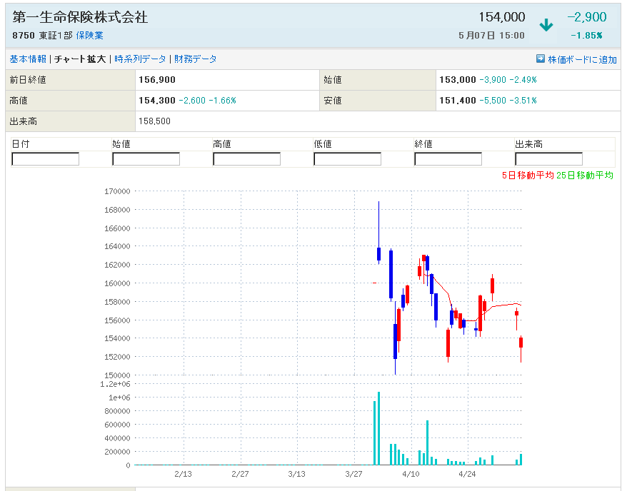 ①8750:第一生命 150100を割らず、陽線引け 波動収斂予想
