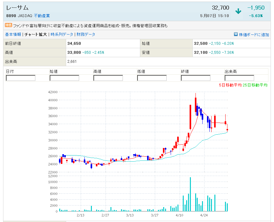 ②8890:レーサム  32700を割らず、陽線引け 底もみ予想
