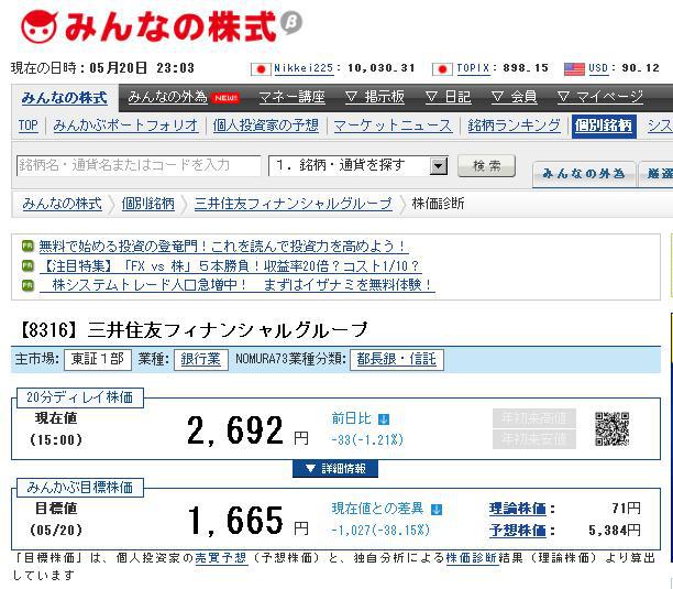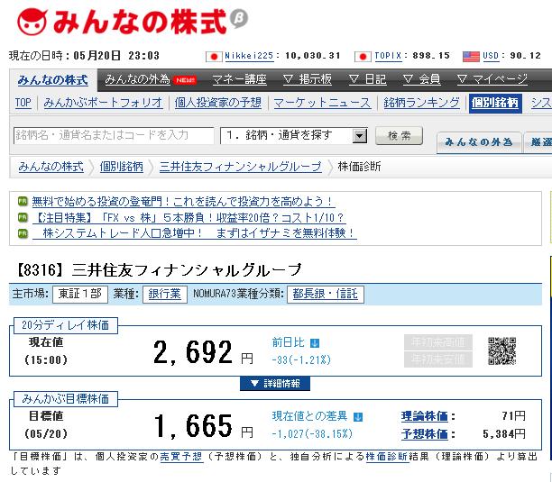 三井住友フィナンシャルグループは割安(下げすぎ)だと思います。ただし、株価はその企業だけでなく、他の要因により決まるのですね。現在のように暴落が起こりそうな状況では、業績が回復してきた企業もまだまだ下がりそうです。