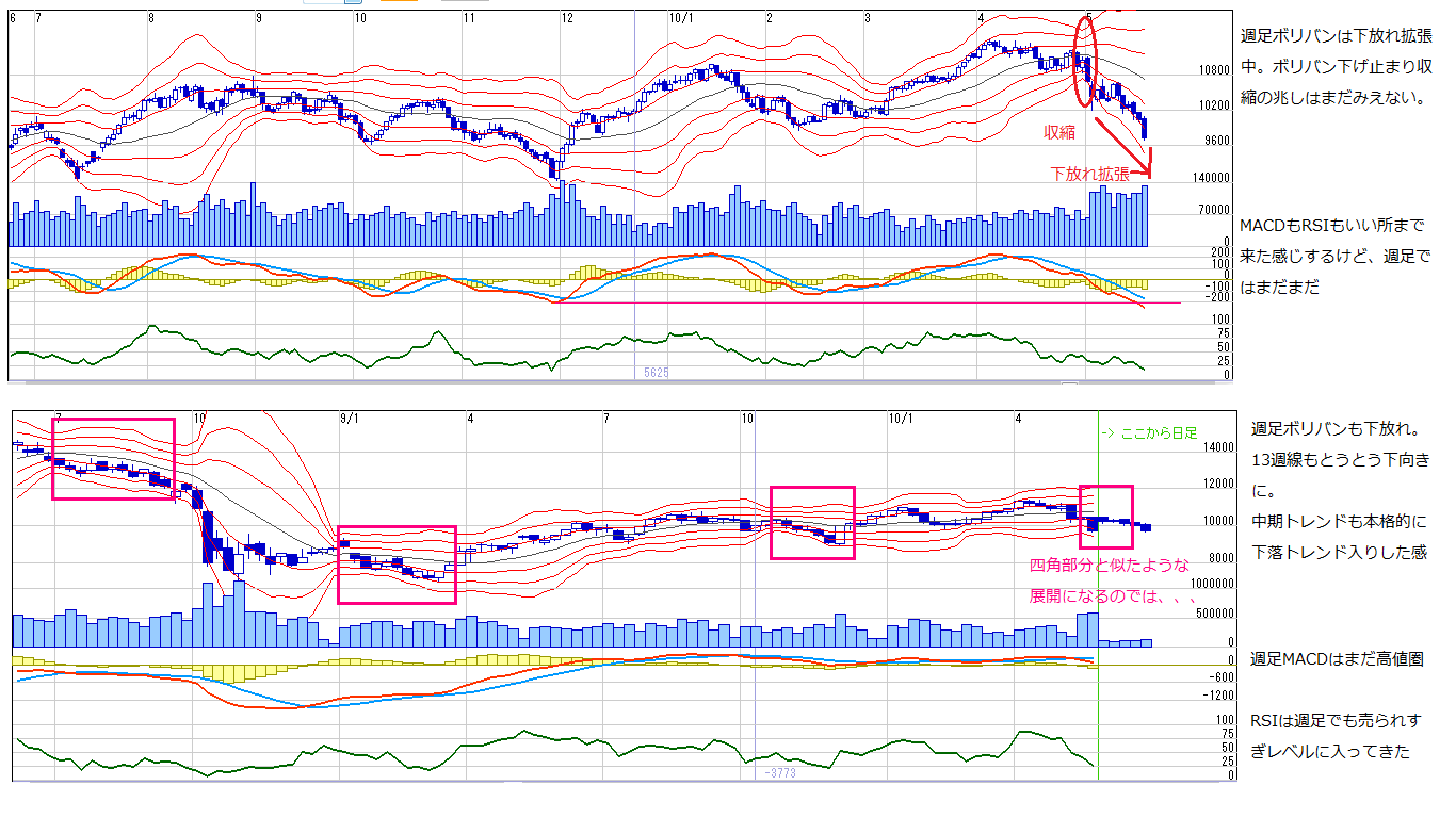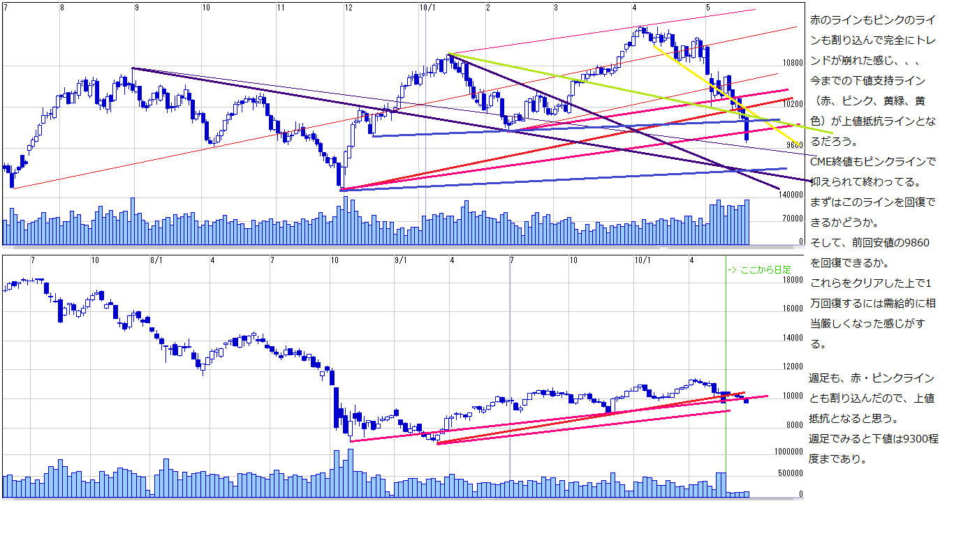 ・下値めどとしては紫・青ラインの重なる9300程度、週足下値ラインも9300程度。
